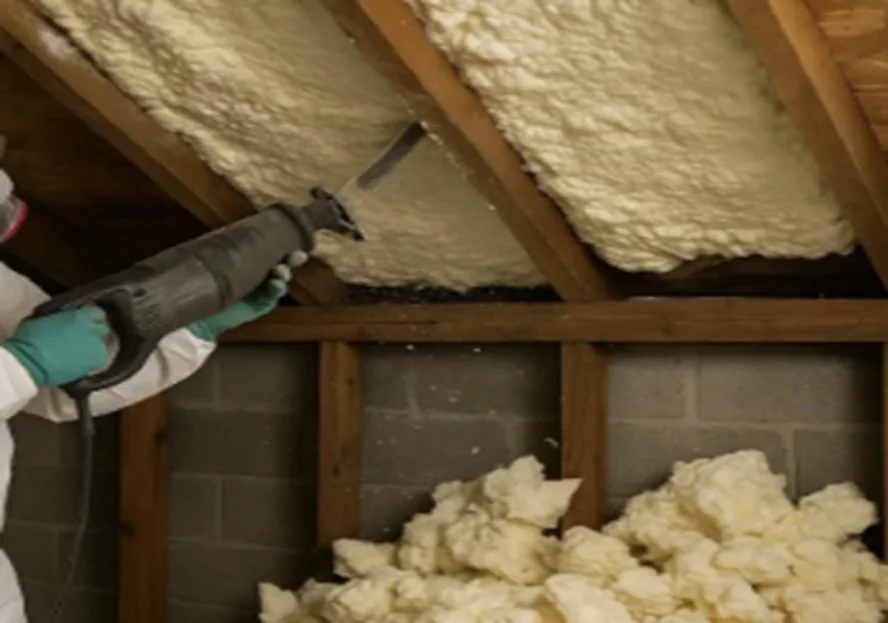 Manual cutting or scraping of the foam from rafters and roof tiles
