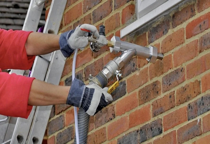 Small holes are drilled in the outer brickwork in order to gain access to the cavity